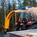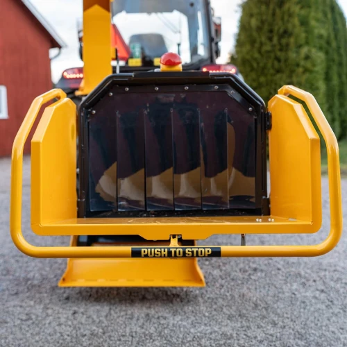 Fliskutteren har et hengslet deksel som gir rask tilgang til knivene – noe som gjør vedlikehold og knivbytte både trygt og tidsbesparende. Det roterbare utkastertårnet (360°) gjør det enkelt å styre flisens retning, enten du laster direkte i en henger eller sprer på bakken. Den dype innmatingstrakten og turtallsvakten gir økt sikkerhet og kontroll under arbeid. Turtallsvakten stopper innmatingen automatisk dersom traktorens turtall synker for mye på grunn av høy belastning, for eksempel når materialet er for grovt eller mates inn i for store mengder. Innmatingstrakten er utstyrt med sprutvern som hindrer at mindre materiale slynges tilbake mot brukeren. Innmatingsåpningen til huggeskiven måler 15 x 20 cm.