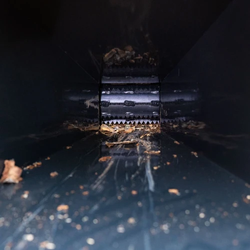 Det hydrauliske systemet med innmatingsrulle og reversfunksjon trekker materialet jevnt inn, noe som reduserer den manuelle innsatsen og optimaliserer flisehastigheten. Innmatingsrullen har horisontalt mønster for best mulig grep på stokkene som flises. Ved grove stokker bør du alltid starte med den smale enden først, da rullene får best grep da. Flishuggerens innmatingsrulle er fjærbelastet for å oppnå maksimalt grep og innmating. Rullene drives av en hydraulikkmotor.